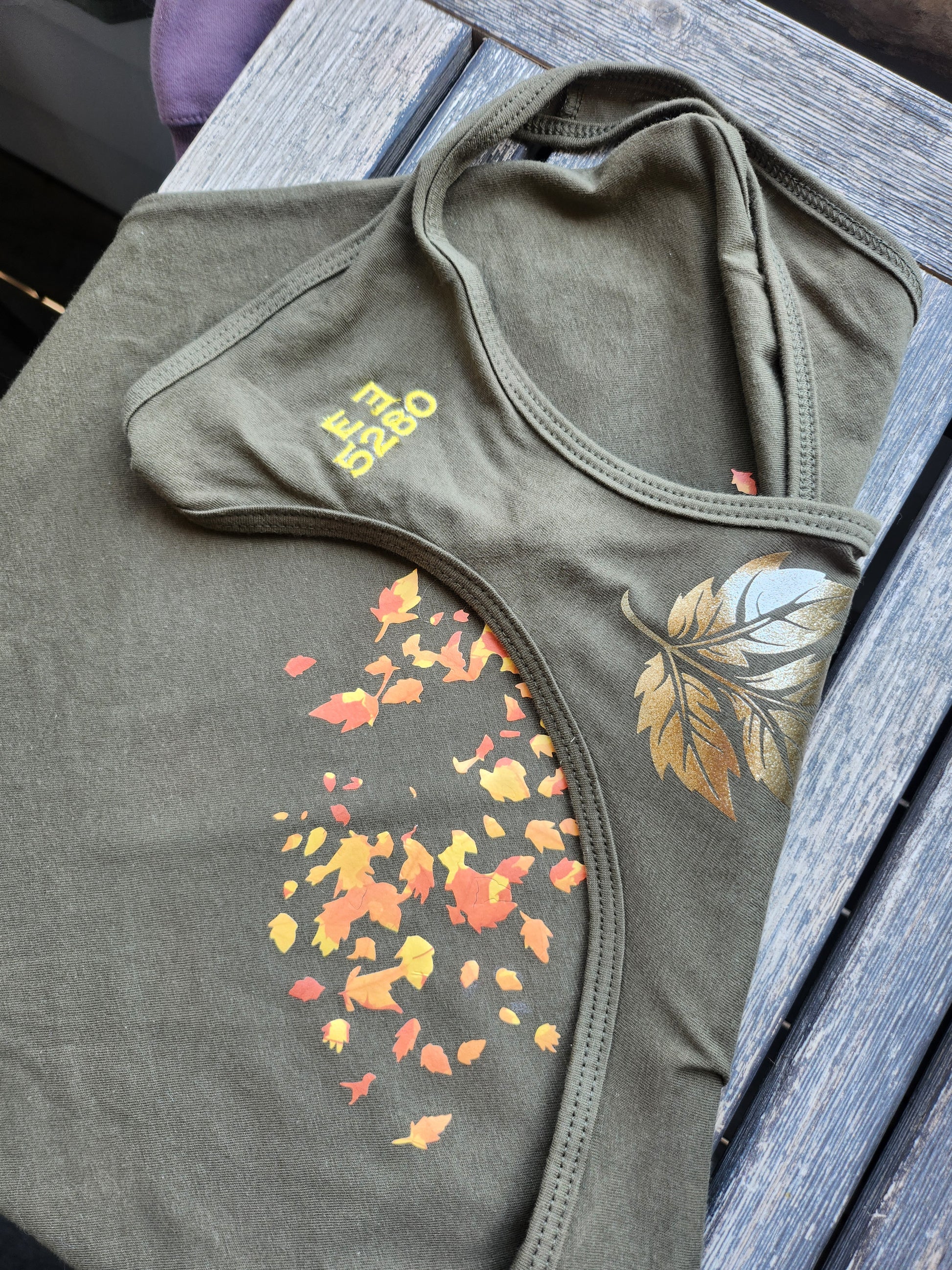 This tank top has fall leaves on the front and a foil leave on the back. It is perfect for everyday wear or for that fall mountain hike. Available in fall orange or rainbow leaves.